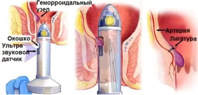 - Дезартеризация. Под контрола на ултразвуковия сензор се превързват съдовете, които осигуряват кръвоснабдяването на хемороидите.