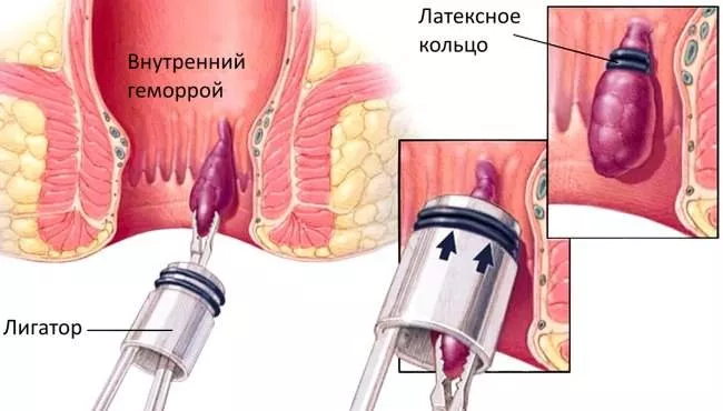 - Лигиране. В основата на хемороида се поставя еластичен пръстен, който прекъсва кръвоснабдяването и след 5-10 дни възелът умира и излиза естествено.